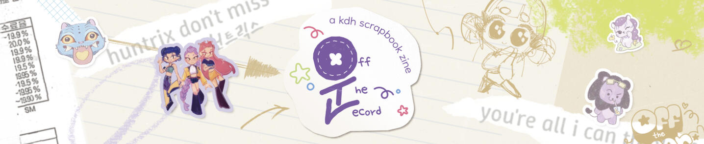 The stage is just a spotlight—but our idols' lives continue past sold-out stadiums and into sleepovers, snack binges, and spilling tea, and every memory is irreplaceable!Find all this & more featured in Off The Record: a KDH Scrapbook zine, which collects backstage moments, memos, and memories of our hunters & demons both on the stage & off.This for-profit project will feature artists and writers! More information about application and project guidelines will be added after our interest check is complete!STATUS: Creation Period!